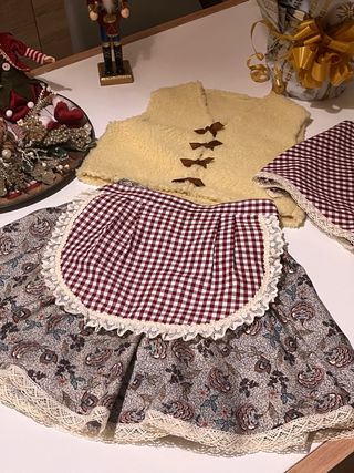 Conjunto de pastora para bebé o niño pequeño. - Chaleco blanco de pelo sintético con tres lazos de cuadros. - Falda marrón con estampado navideño de regalos y árboles. - Delantal rojo con encaje dorado. - Capa roja con borde dorado.