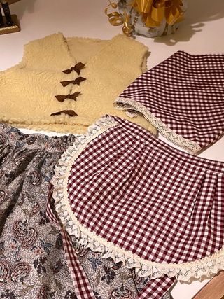 Conjunto de pastora para niña, talla 6. Incluye chaleco, falda y delantal. - Chaleco de tejido suave color crema con cierres de lazo. - Falda estampada con motivos florales y encaje en el bajo. - Delantal de cuadros vichy en color burdeos con volante de encaje.