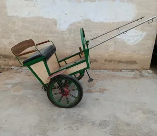 Carro de dos ruedas, ideal para ponis. Su diseño permite un paseo cómodo y seguro. Es para poni de 1 m por hay lleva frenos en ambas ruedas , fustero con las baras en acero inoxidable y banastilla con ballesta un capricho de carro - Estructura de metal y madera. - Ruedas con radios verdes y centro rojo. - Asiento de madera con respaldo.
