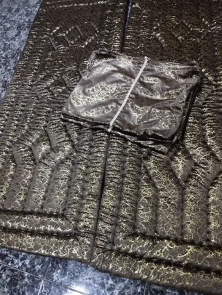 Elegante alfombra de oración con un diseño intrincado y detalles dorados. Incluye una bolsa a juego para facilitar su transporte. - Diseño acolchado. - Tejido con estampado dorado. - Bolsa de tela a juego.