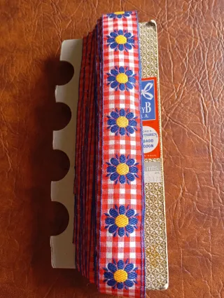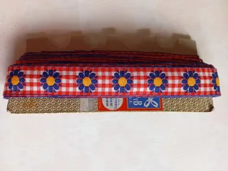 Cinta de tela con un diseño de cuadros rojos y blancos, adornada con flores bordadas en azul y amarillo. - Borde lateral con detalles en azul. - Ideal para manualidades y decoración.de ropa cama o mantelería etc.mide 19'20cm. Y algo más de tres centímetros de ancha.