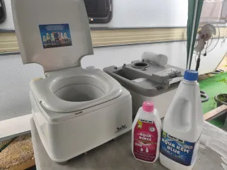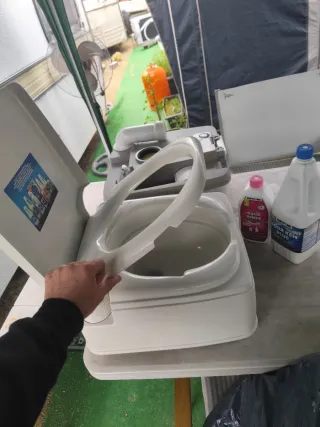 WC portátil Thetford Porta Potti Elegance, ideal para caravanas, barcos o camping. - Diseño moderno y funcional. - Tapa abatible. - Indicador de nivel de depósito. - Incluye dos productos Thetford: Aqua Rinse Concentrated y Aqua Kem Blue.