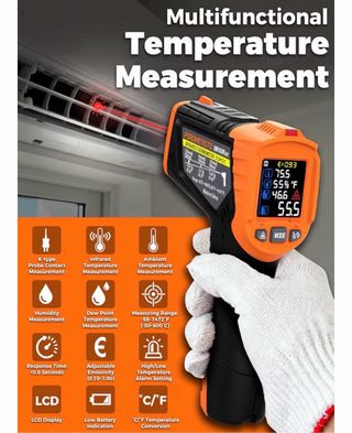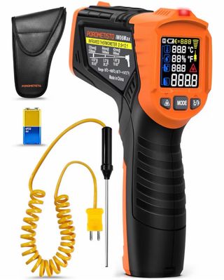 Termómetro infrarrojo láser digital con sonda K, modelo IM06MAX. Permite medir temperaturas de -50°C a 800°C. - Pistola de temperatura IR. - Detección de punto de rocío. - Ideal para industria, HVAC, cocina y reparación de vehículos.