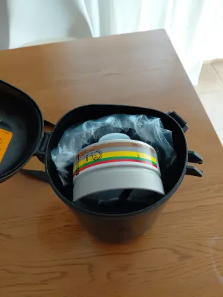 Máscara MSA con su bote de transporte y filtro incluido. Lista para su uso. - Bote de transporte negro. - Filtro con codificación de colores. - Filtro caducado. - Tal cual como se puede ver en las fotos. - Gastos de envío por cuenta del comprador. - Solo se hacen envíos por walapop.