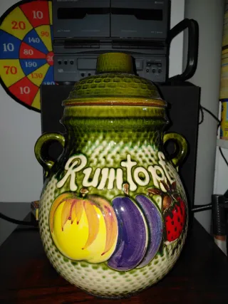 Vasija decorativa con diseño de frutas y el texto Rumtopf. - Acabado en cerámica. - Diseño con calabaza, berenjenas y fresa. - Asas laterales. - Tapa a juego.