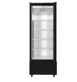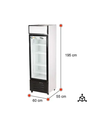 Nevera expositora vertical con puerta de cristal. - Alto: 195 cm - Ancho: 60 cm - Profundidad: 55 cm - Estantes interiores ajustables - Iluminación LED superior - Ruedas para fácil movilidad