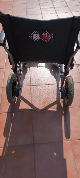 Silla de ruedas ligera y plegable, fácil de transportar y almacenar. Ideal para movilidad. - Estructura de metal plateado. - Asiento y respaldo en tela negra. - Ruedas traseras grandes y delanteras pequeñas. SOLO RECOGIDA EN BARCELONA