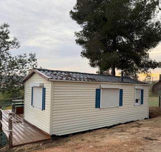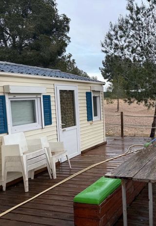 Mobil home Sun Living, - Ventanas con persianas enrollables. - Tejado a dos aguas. - 2 baños, uno es wc solo y el otro ducha con lavabo. 2 habitaciones dobles. Esta muy bien, cocina con gas y una nevera combi. Hay algunas persianas que se han roto las cuerdas. La cocina se tendria q apretar porque del traslado se ha movido algun armario. Puedo enviar fotos del interior bajo peticion. Esta en muy buen estado, falta darle el toque personal y listo.