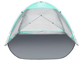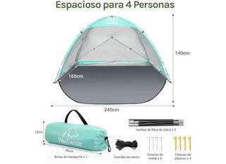 Refugio de playa Wolfwise con protección UV y bolsa de transporte. Ideal para la playa. - 3 ventanas de ventilación. - Tienda de campaña con suelo extensible para privacidad. - Capacidad para 4 personas. - Color verde menta.