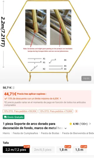 Estructura de arco hexagonal dorada, perfecta para crear un punto focal en eventos. - Material: Metal. - Color: Dorado. - Altura: 2.2 metros (7.21 pies). - Diseño: Hexagonal.