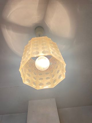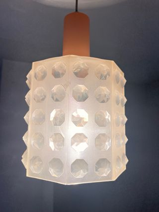 Lámpara colgante con un diseño único y llamativo. Su estructura hexagonal está adornada con múltiples facetas que refractan la luz. - Diseño hexagonal. - Facetas decorativas. - Aporta un toque de estilo a cualquier estancia.