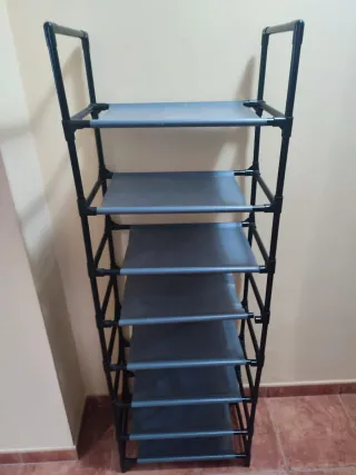 Práctico zapatero de seis niveles para organizar tu calzado. Recogida solo en mano en torredonjimeno - Estructura de tubos metálicos negros. - Estantes de tela gris resistente. - Diseño vertical para optimizar espacio.