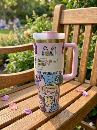 Vaso Stanley Quencher H2.0 con diseño exclusivo de LoveShackFancy. - Color rosa pálido. - Ilustraciones de personajes. - Incluye pajita a juego.