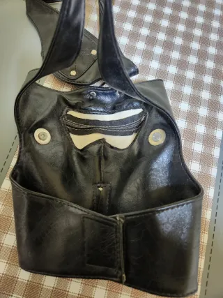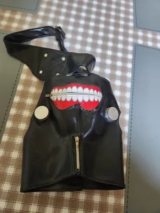 Máscara negra inspirada en Kaneki, con un diseño llamativo. - Material: Cuero sintético. - Cierre de cremallera frontal. - Detalle de dientes rojos y blancos. - Dos adornos circulares plateados a los lados. - Correa ajustable para la cabeza.