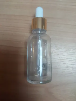 7 Frascos gotero de cristal transparente con capacidad de 30ml. Ideal para almacenar líquidos o aceites esenciales. - Material: Cristal - Capacidad: 30ml - Incluye cuentagotas con tapa plateada/dorada y capuchón blanco.