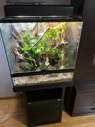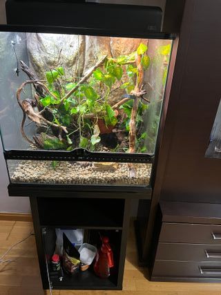Se vende terrario de cristal con mueble. - Medidas del terrario: 60 cm de ancho, 45 cm de profundidad y 60 cm de alto. - El mueble es negro y tiene un espacio de almacenamiento debajo del terrario.