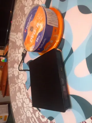 Grabadora de DVD externa Nueva solo con un par de usos por 10€, En tiendas esta por 30€ Podeis mirarlo en google + Tarrina de 25 discos DVD-R Verbatim x 10€, Total 20€ los 2 productos, no se venden por separado, El precio no es negociable los productos no son mios. Se hacen envios y lotes, Si quieres hacer trato en mano podemos quedar en la tienda "Frutos Secos El Español" que está junto a mi casa. Avísame antes y nos vemos allí. Calle Nardos 5, Torrejón de Ardoz. Con la garantía de saber donde vivo y si hay algún problema con el producto se devolvería el dinero.