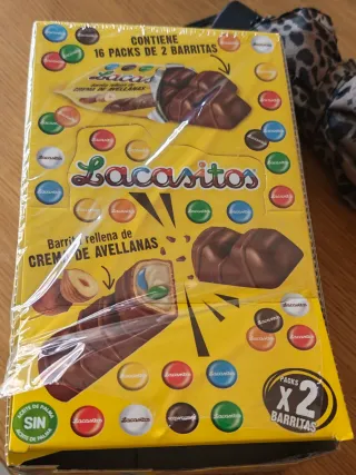 Caja de Lacasitos con barritas rellenas de crema de avellanas. Contiene 16 packs de 2 barritas cada uno. - Barritas de chocolate con relleno cremoso. - Sabor a crema de avellanas. - Formato individual en packs.