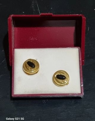 Elegante par de gemelos. Son de color dorado con detalles en ónix negro. Se encuentran en su caja original. - Diseño clásico y sofisticado. - Material: Metal dorado y ónix. - Incluye dos gemelos.