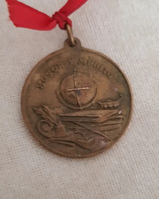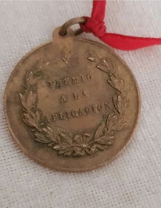 Se vende medalla antigua. Es de metal bronceado y parece estar en buen estado, aunque con señales normales de uso. - Medalla 'Premio a la Aplicación' - Medalla 'Honor y Mérito' - Incluyen cintas rojas.