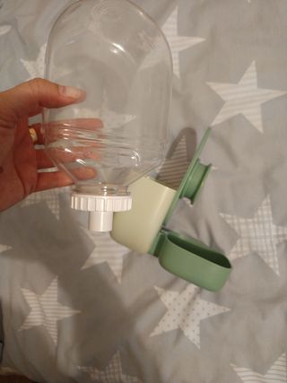 Práctico bebedero para encajar en la jaula o cualquier sitio con barrotes de tus mascotas. Su diseño permite dispensar agua fácilmente. - Botella transparente. - Dispensador de agua.