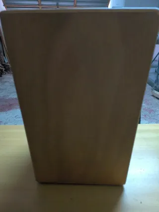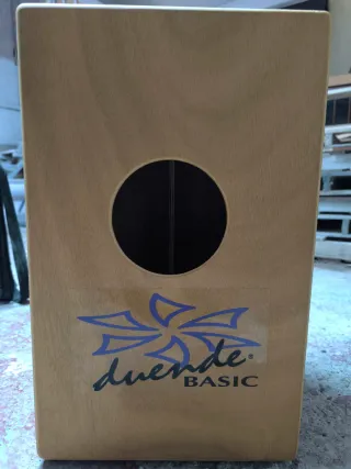 Cajón de percusión marca Duende, modelo Basic. - Acabado en madera clara. - Diseño con agujero frontal. - Logo de la marca visible.
