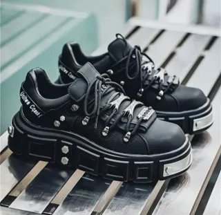 Zapatillas deportivas de estilo punk rock con plataforma. - Color negro. - Diseño con cordones y detalles metálicos. - Plataforma gruesa con adornos. - Inscripción en la parte trasera. - talla 39