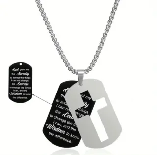 Conjunto de cadena con dos colgantes tipo chapa, uno de ellos con diseño de cruz. - Colgante con texto de la oración de la serenidad. - Colgante con diseño de cruz. - Cadena de eslabones.