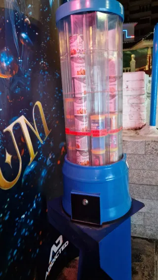 Máquina expendedora de monedas para frutos secos y gominolas. Ideal para negocios o eventos. - Dispensador de productos en lata. - Diseño en color azul. - Precio de 1€ por producto.