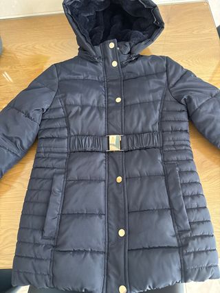 Abrigo acolchado para niña de la marca Kids. - Color azul marino. - Capucha con forro de pelo. - Cinturón con hebilla dorada. - Cierre de botones dorados. - capucha desmontable con cremallera