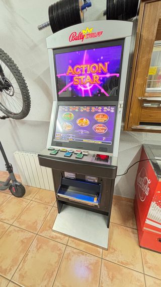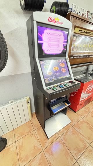 Máquina tragaperras de la marca Bally Wulff. - Pantalla principal con gráficos. - Panel de juego con botones. - Compartimento para monedas.