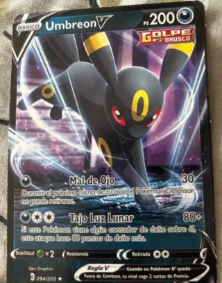 Carta de Pokémon de Umbreon V. - Ataque Mal de Ojo con coste de 1 Energía. - Ataque Tajo Luz Lunar con coste de 3 Energías. - Debilidad x2. - Resistencia. - Retirada con coste de 2 Energías. - Regla V: Cuando tu Pokémon V queda Fuera de Combate, tu rival coge 2 cartas de Premio.