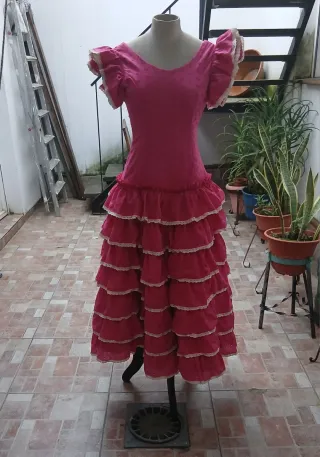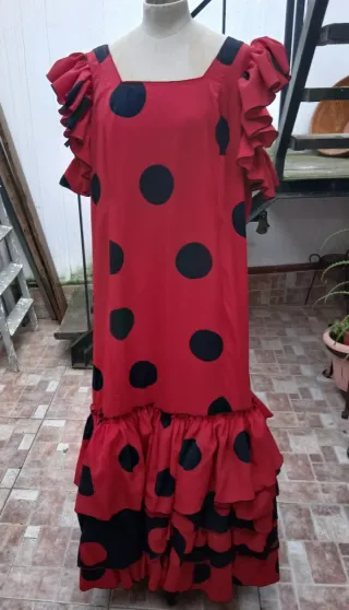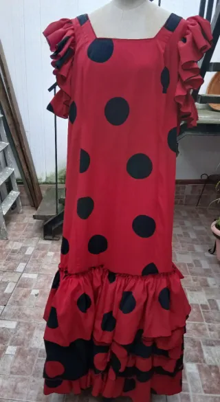 Vestido de flamenca rojo con lunares negros, ideal para ferias y romerías. Presenta volantes tanto en las mangas como en la falda. - Diseño de lunares negros sobre fondo rojo. - Mangas con volantes. - Falda con múltiples volantes. Talla M Talla Pecho 42 Cintura 36 Cadera44 Largo 170 tiene algo para sacarle no tiene elastico