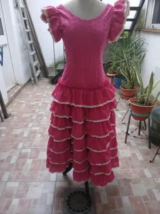 Vestido de flamenca de color rosa vibrante, con múltiples volantes y detalles de encaje. - Diseño con pequeños topos. - Mangas abullonadas con volantes. - Múltiples volantes escalonados en la falda. - Adornos de encaje en los volantes y el bajo. Talla xs