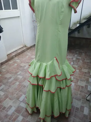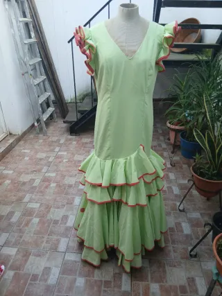 Vestido de flamenca de color verde con detalles en los volantes. - Diseño con escote en V. - Mangas con volantes. - Falda con varios volantes. - Ribete en color coral en los volantes. Talla Pecho 96 Cintura 84 Cadera 100 Largo 150
