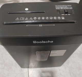 Trituradora de papel marca Woolsche, ideal para uso doméstico o de oficina con muy poco uso y en muy buen estado. - Capacidad para triturar hasta 10 hojas a la vez. - Tritura CDs y DVDs. - Diseño compacto y moderno en color negro.