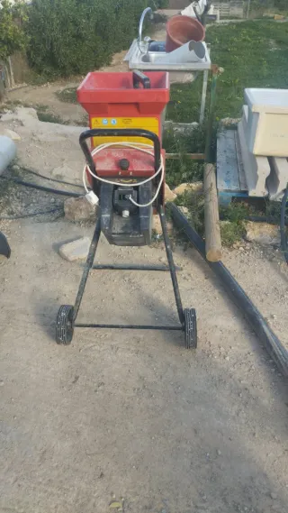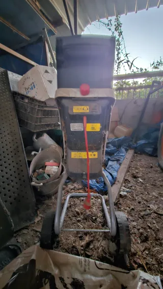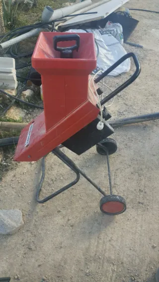 Se vende trituradora de jardín en color rojo. Ideal para procesar restos de poda y material orgánico. - Estructura metálica. - Ruedas para facilitar el transporte. - Tolva de entrada superior.