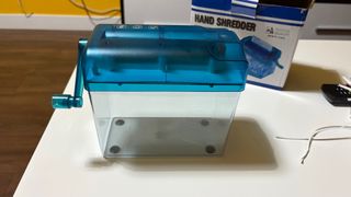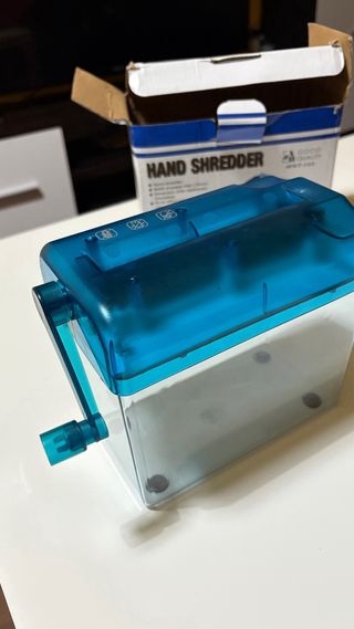 Trituradora de papel manual con un diseño transparente y detalles en azul. Está como nuevo, se ha triturado un papel para la foto. - Mecanismo de manivela. - Cubo receptor transparente