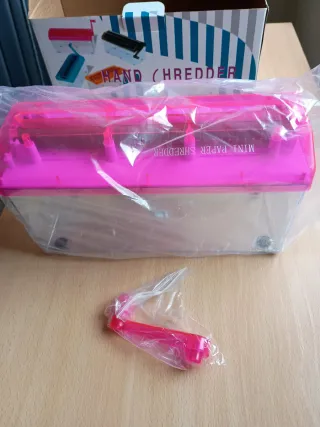 Trituradora de papel manual de color rosa, ideal para uso doméstico o de oficina. - Diseño compacto y portátil. - Incluye manivela para su funcionamiento. - Apta para triturar documentos.