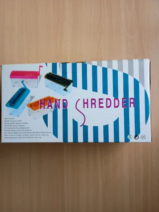Trituradora de papel manual, ideal para uso doméstico . Permite destruir documentos de forma segura. - Ancho de entrada del papel: 123 mm. - Dimensión del papel triturado: 3 mm (tira). - Para destruir archivos y documentos . Uso doméstico - El triturado se acumula en la caja. - Limpiar con un paño suave y detergente neutro. - No introducir peso excesivo, manos, cortaúñas o clips en la entrada. - No abrir ni reparar la máquina sin permiso.