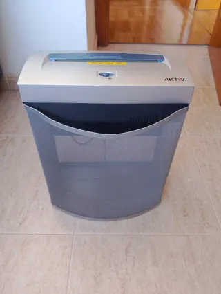 Trituradora de papel AKTIV con papelera de malla. - Diseño moderno en color plata y negro. - Papelera de malla gris. - Panel de control superior. - También tritura tarjetas Solo se ha usado para verificar que funciona Altura 40 cm