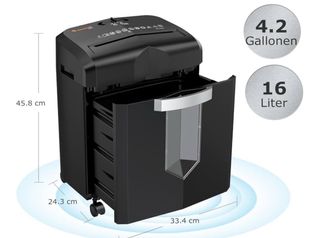 Trituradora de papel de color negro con una capacidad de 16 litros. - Dimensiones: 45.8 cm (alto) x 33.4 cm (ancho) x 24.3 cm (profundidad). - Capacidad de la papelera: 4.2 galones / 16 litros.
