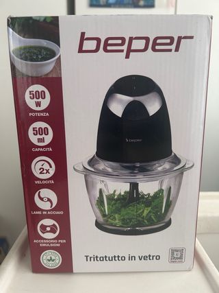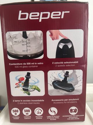 Triturador de vidrio Beper con motor de 500W y capacidad de 500ml. Ideal para picar hierbas y otros ingredientes. - Potencia: 500W - Capacidad: 500ml - Velocidad: 2x - Cuchillas de acero - Accesorio para emulsiones