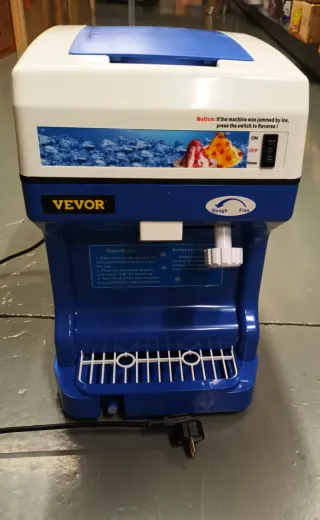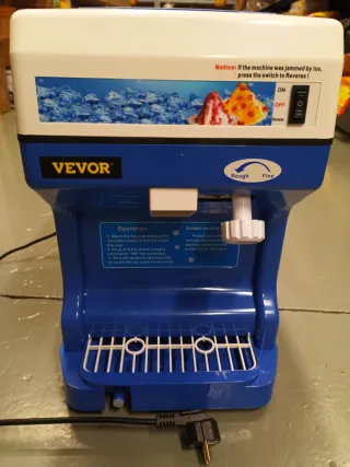 Trituradora de hielo VEVOR en color azul y blanco. Ideal para preparar bebidas y postres. - Capacidad de trituración de 120 Kg/h. - Potencia de 250W. - Ajuste de granulación para hielo fino o grueso. - Interruptor de reversa para atascos.