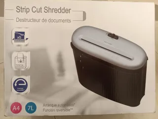 Trituradora de documentos con corte en tiras. Ideal para uso doméstico o de oficina. - Capacidad de triturado: 5 hojas. - Papelera de 7L. - Función de arranque automático. - Función reversible para evitar atascos. - Compatible con tamaño de papel A4. - Incluye caja e instrucciones