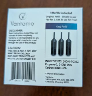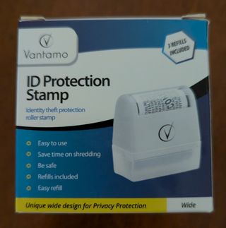 Se ofrece un sello rodillo Vantamo para proteger la identidad. Incluye 3 recambios. Es fácil de usar y permite ahorrar tiempo al no tener que triturar documentos. Diseño ancho para una mayor protección de la privacidad. El sello está totalmente nuevo.