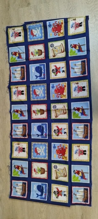 Conjuntos de paneles de tela con temática pirata, ideales para proyectos de costura y manualidades. - Diseños variados con piratas, barcos, pulpos y loros. - Fondo azul marino. - Borde decorativo en cada panel desde 5€