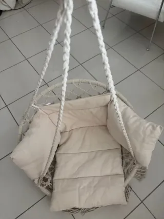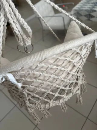 Cómoda hamaca tipo columpio, perfecta para usar tanto en interiores como en exteriores. Su diseño tejido le da un toque bohemio y relajante. - Material de cuerda resistente. - Cojín acolchado incluido para mayor confort. - Flecos decorativos en la base.
