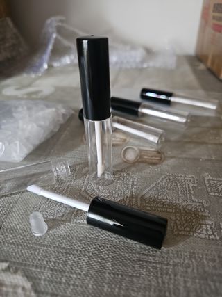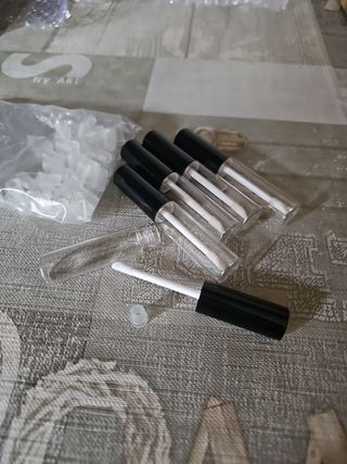 Envase para lips gloss, de plástico transparente, de 8ml. 60uds. 0,45€/ud. 9cm de alto. Si quieres menos uds. envíame un mensaje. Si te llevas todos, una botella transparente de recambio y unos 5 taponcitos de recambio de regalo.