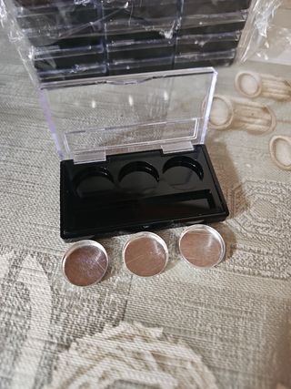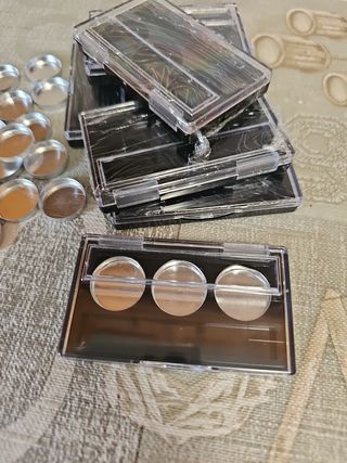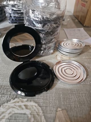 Envase para maquillaje compacto, con espejo. Diámetro interior de 5cm. Diámetro del envase 7cm. 10g aprox. 2 paquetes de 7uds. 1,30€/ud. 1 paquete de 4uds. 1,30€ud. Precio de un paquete de 7uds. Si estás interesada en todo, o en alguno que no sea 1 paquete de 7uds. Envíame un mensaje